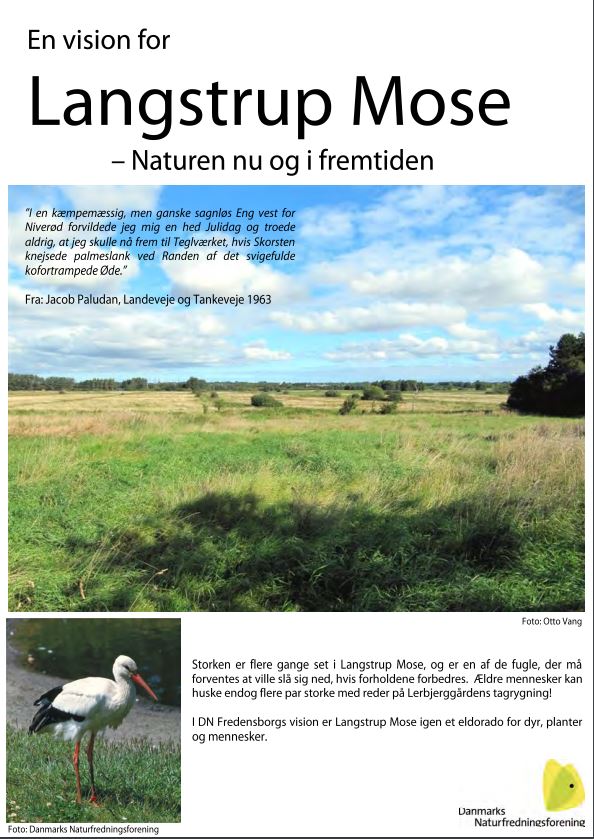 I 2013 fremstillede vi en folder, der fortalte om Langstrup Mose.Storken er flere gange set i Langstrup Mose, og er en af de fugle, der må forventes at ville slå sig ned, hvis forholdene forbedres. Ældre mennesker kan huske endog flre par storke med reder på Lerbjerggårdens tagrygning.